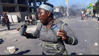 Une dame en possession de deux grenades lacrymogènes utilisées par des policiers, lors d’une manifestation Ouvrière. Par Jacques Kolo, Port-au-Prince, 17 février 2022 –(RHInews)- Des agents de la police nationale ont tenté brutalement ce 17 février 2022 de mettre fin prématurément à une manifestation d’ouvriers du secteur textile, dans l’aire du Champ-de-Mars (Port-au-Prince), a constaté des reporters sur place.